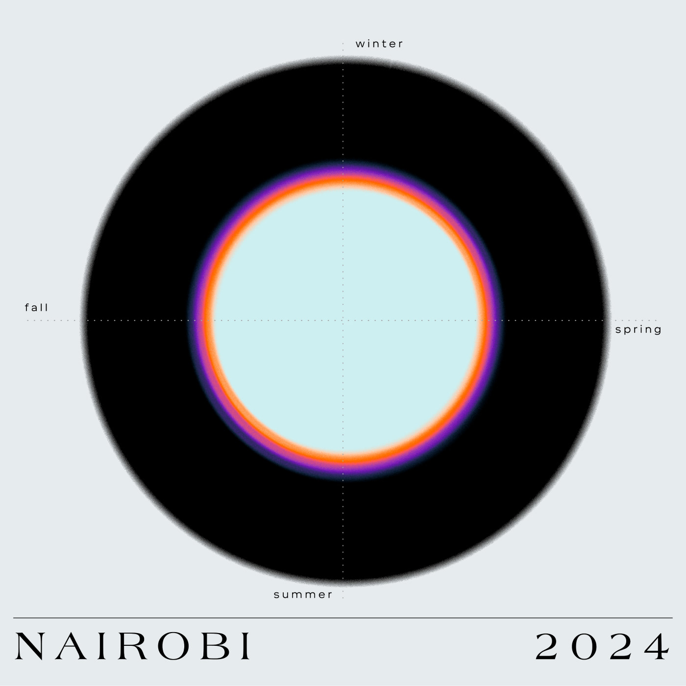 The arrangement of the halos reflects the geography and seasons of the cities: in Nairobi, near the equator, the halos are almost perfect and symmetrical, while in Europe or the Southern Hemisphere, their orientation changes according to the seasons. In summer, the twilight phase in Oslo, near the Arctic Circle, takes a unique shape, resembling a halo of light projected onto a sphere.